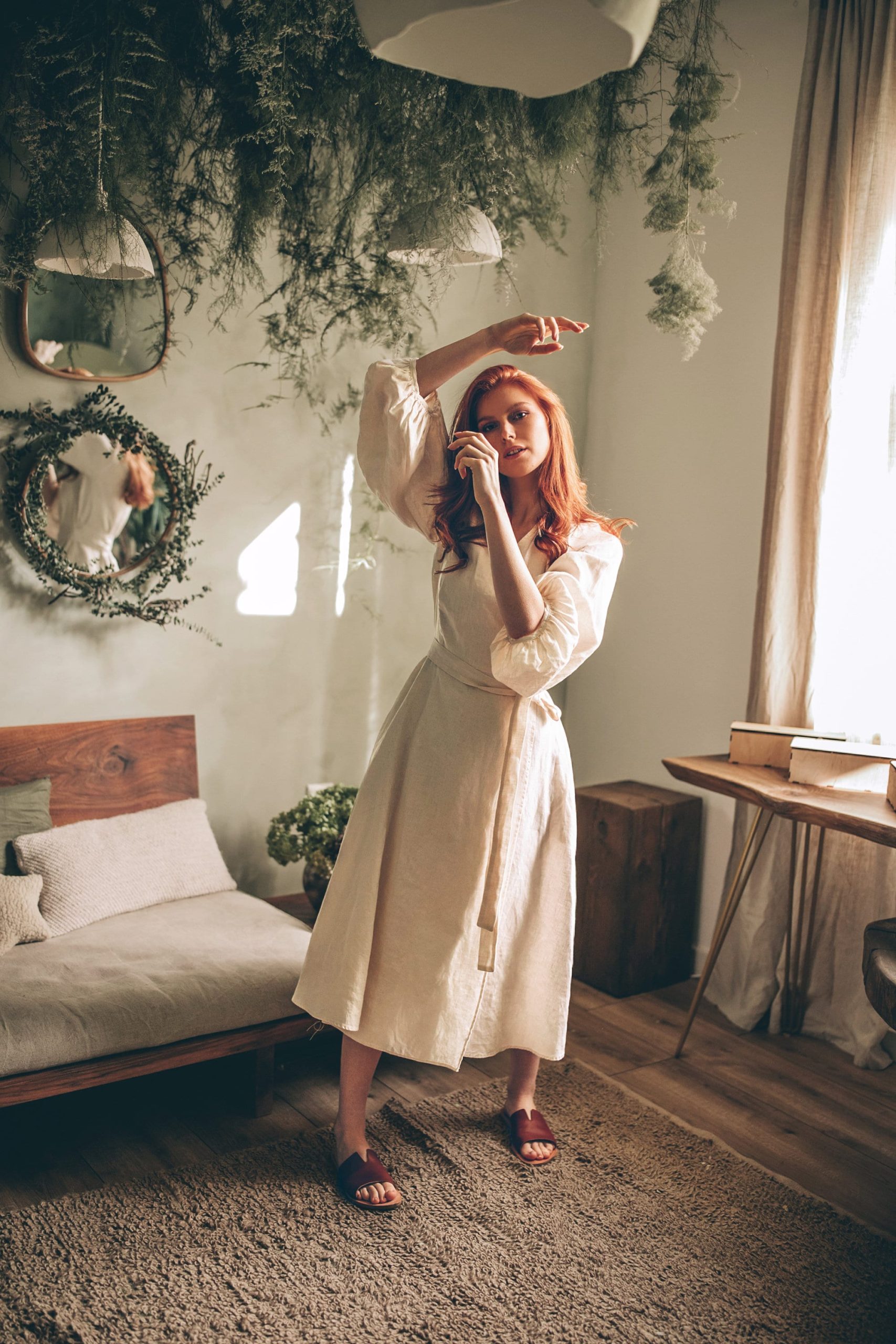 Our staple midi wrap linen dress with a rich puff sleeve accent. Made from 100% natural washed and soft linen, this comfortable and elegant piece has a V-neckline, side pockets and a tie belt closure that emphasises the waist. Featured in Cream here, this dress comes in a variety of colors.