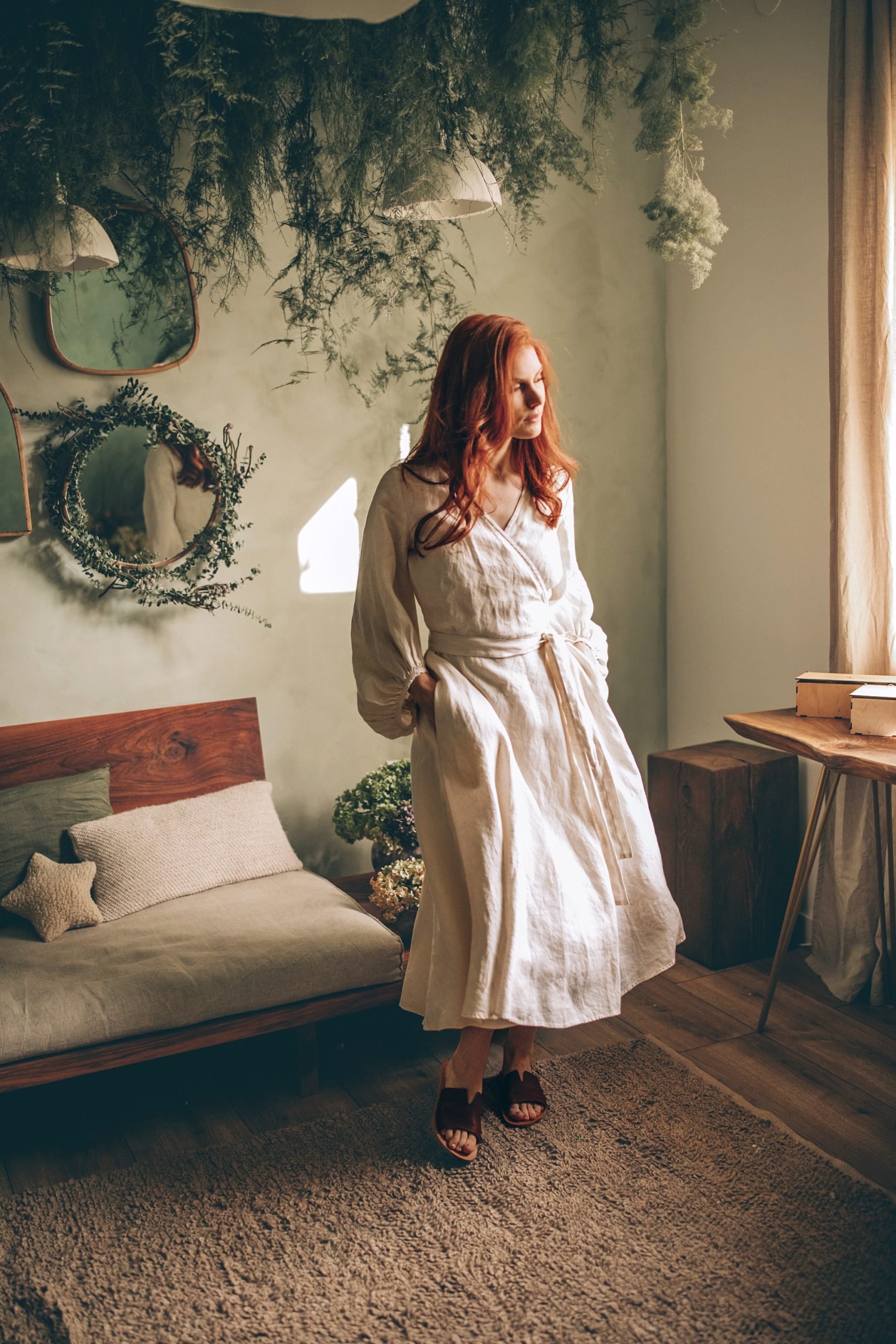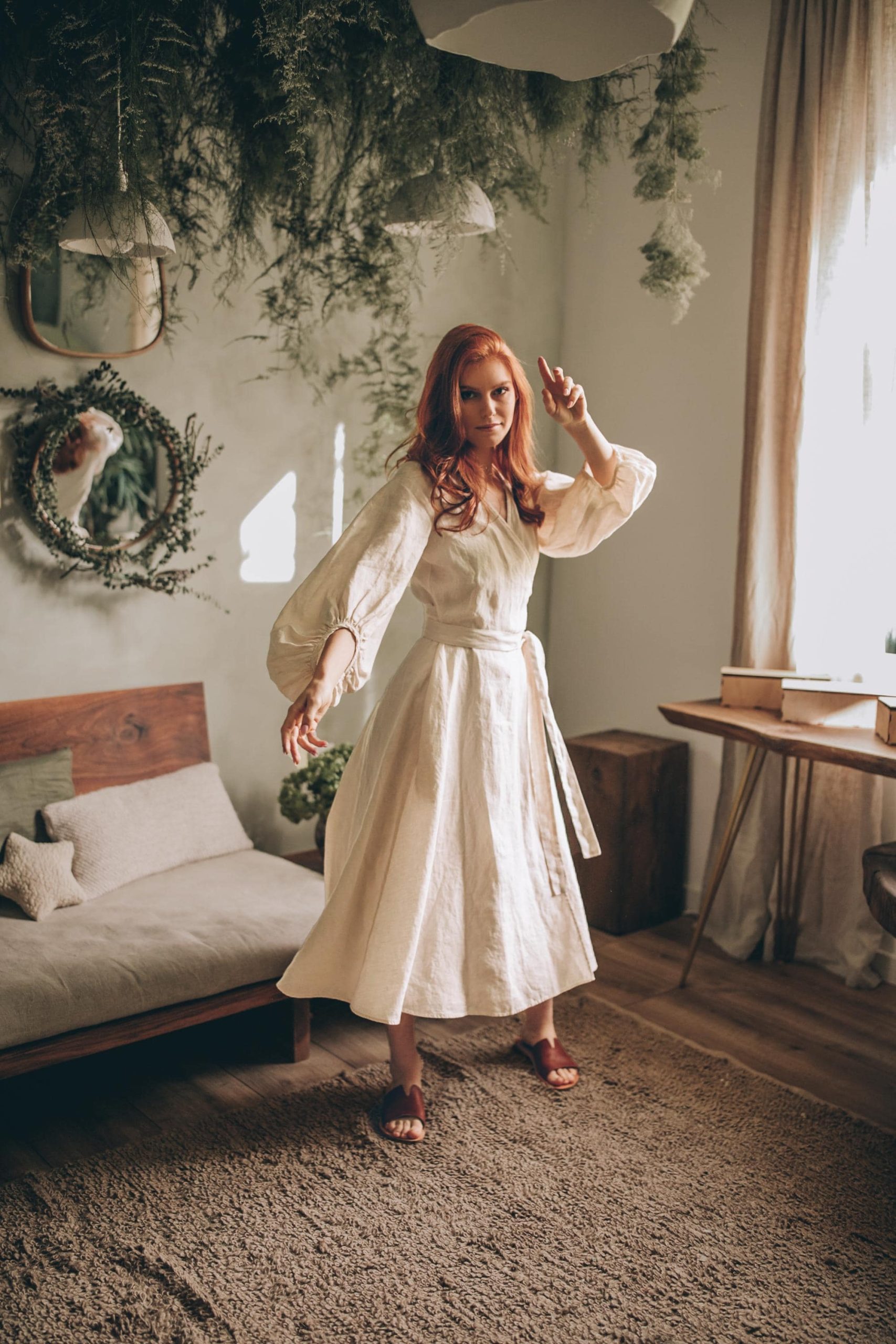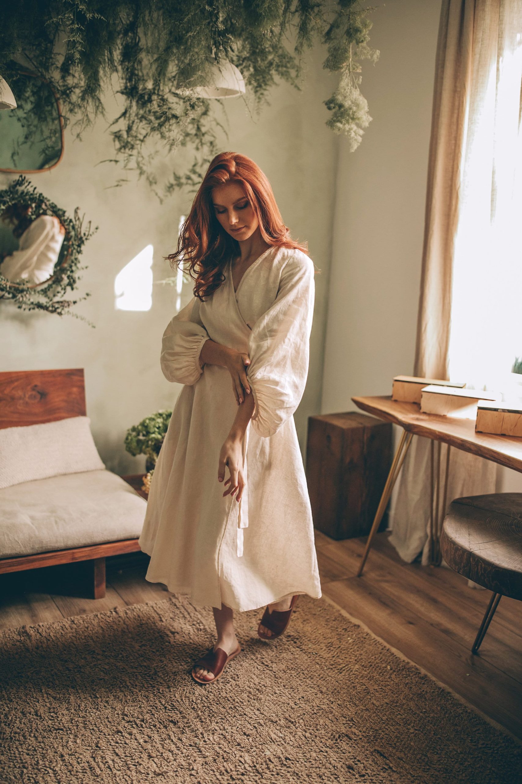 Cream Linen Wrap Dress Bishop Sleeve Midi