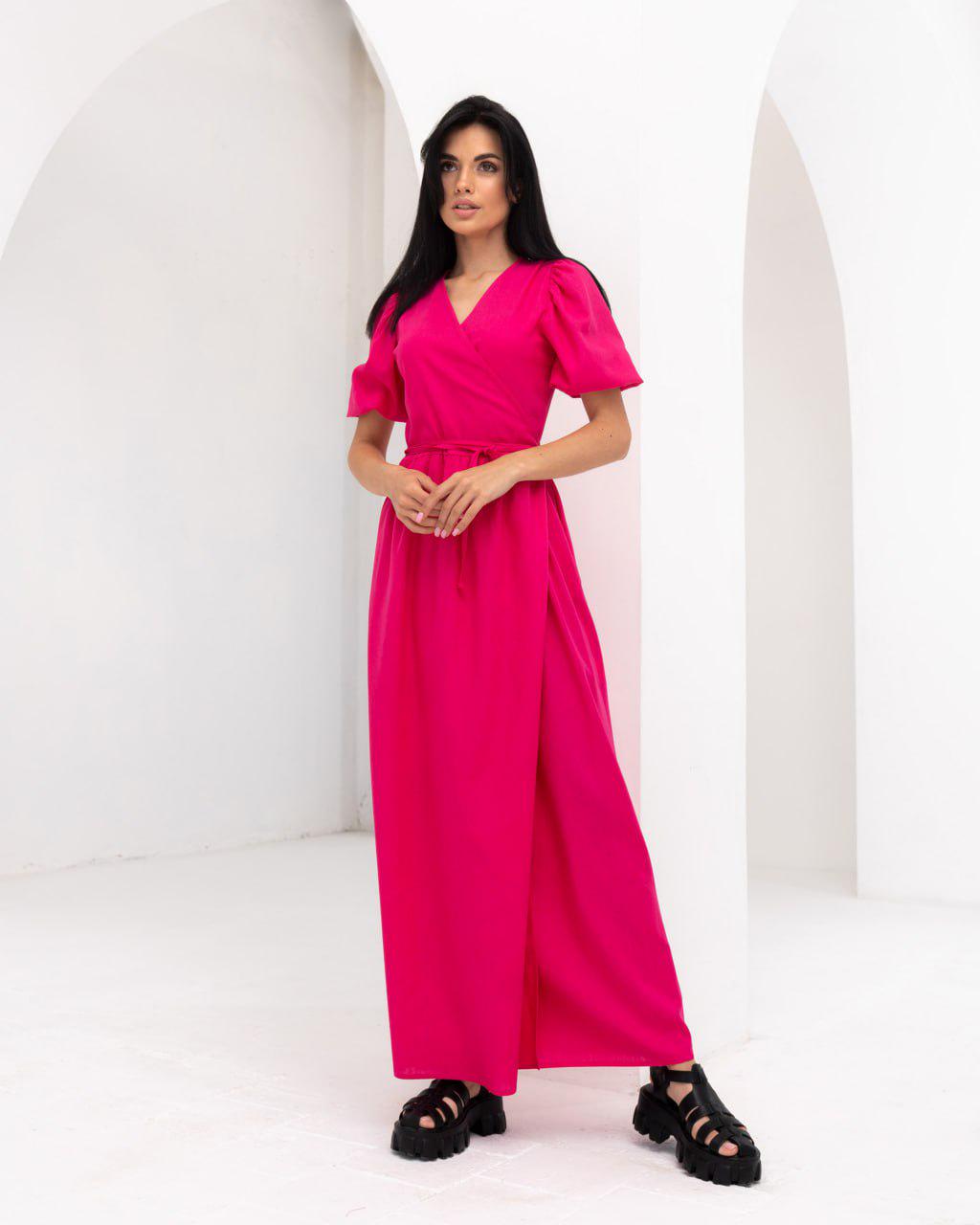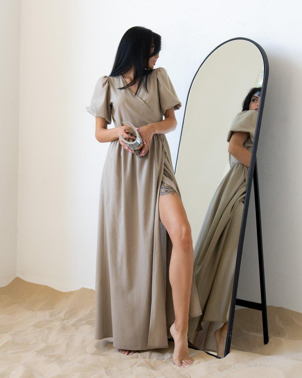 Comfortable, light and delicate linen dress combined with a classic silhouette. Bodice with an elastic band, perfect for slender girls and owners of curvaceous forms. There are 2 high slits on the skirt in the front. The sleeve is sewn on, with an elastic band.