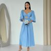 The dress fits the figure – the fit of the dress is thought out so that it can be worn by tying a belt on the back – then you will get an emphasized neckline area. If you wear the dress the other way around – there will be a corset on the front, and a buttonhole formed by a belt on the back.