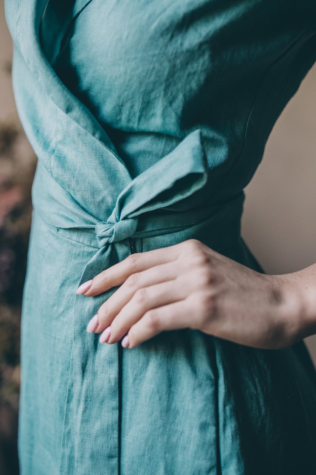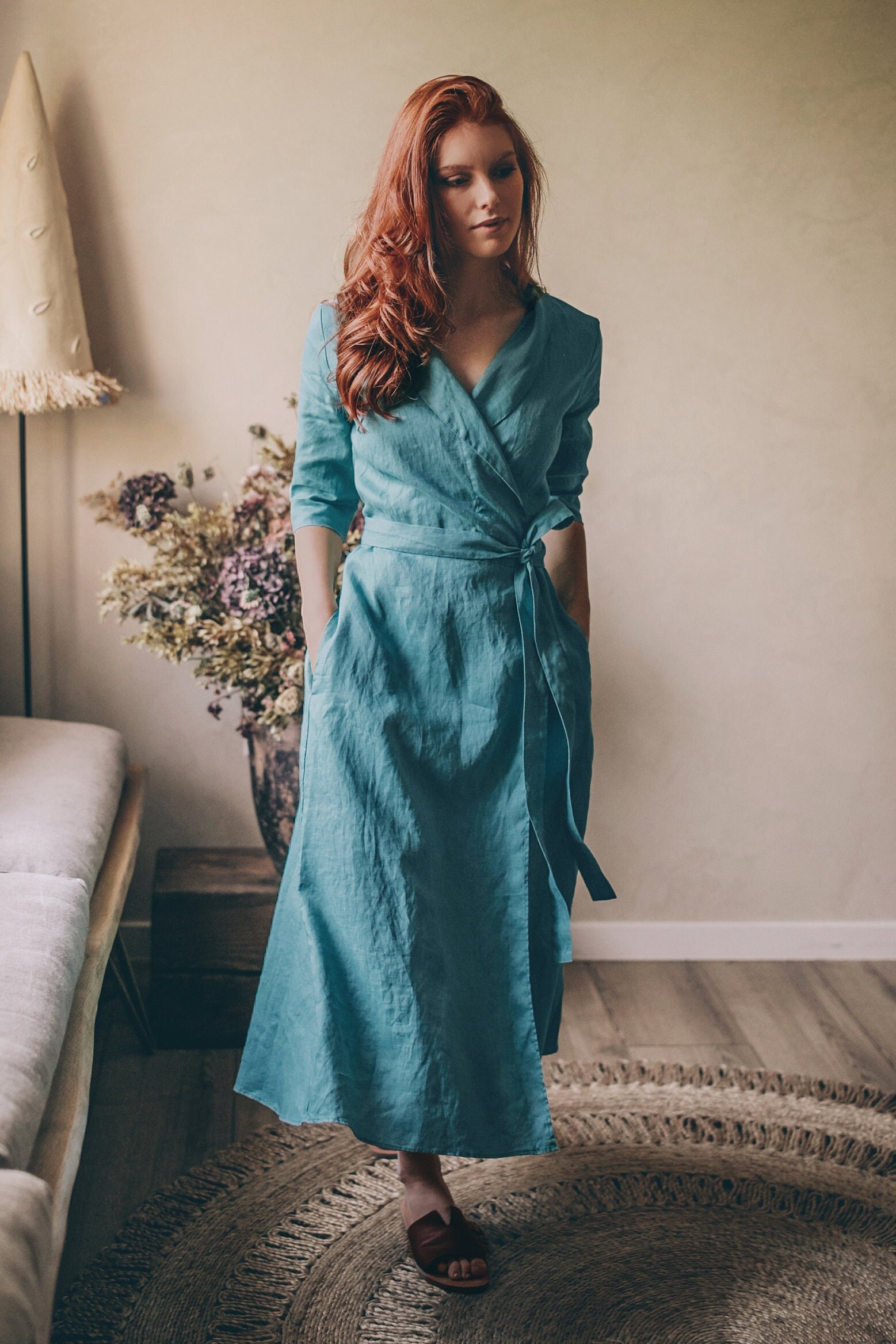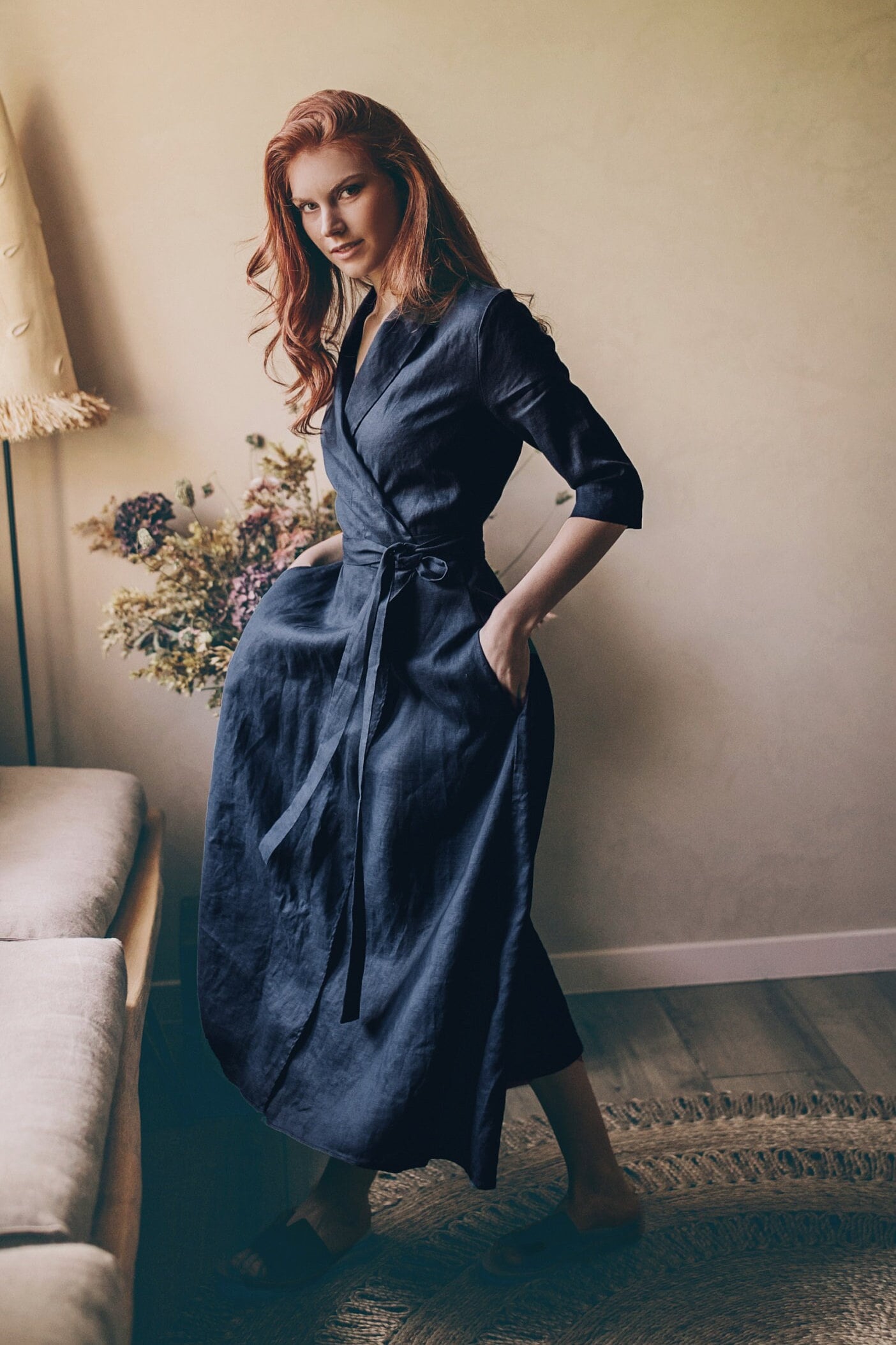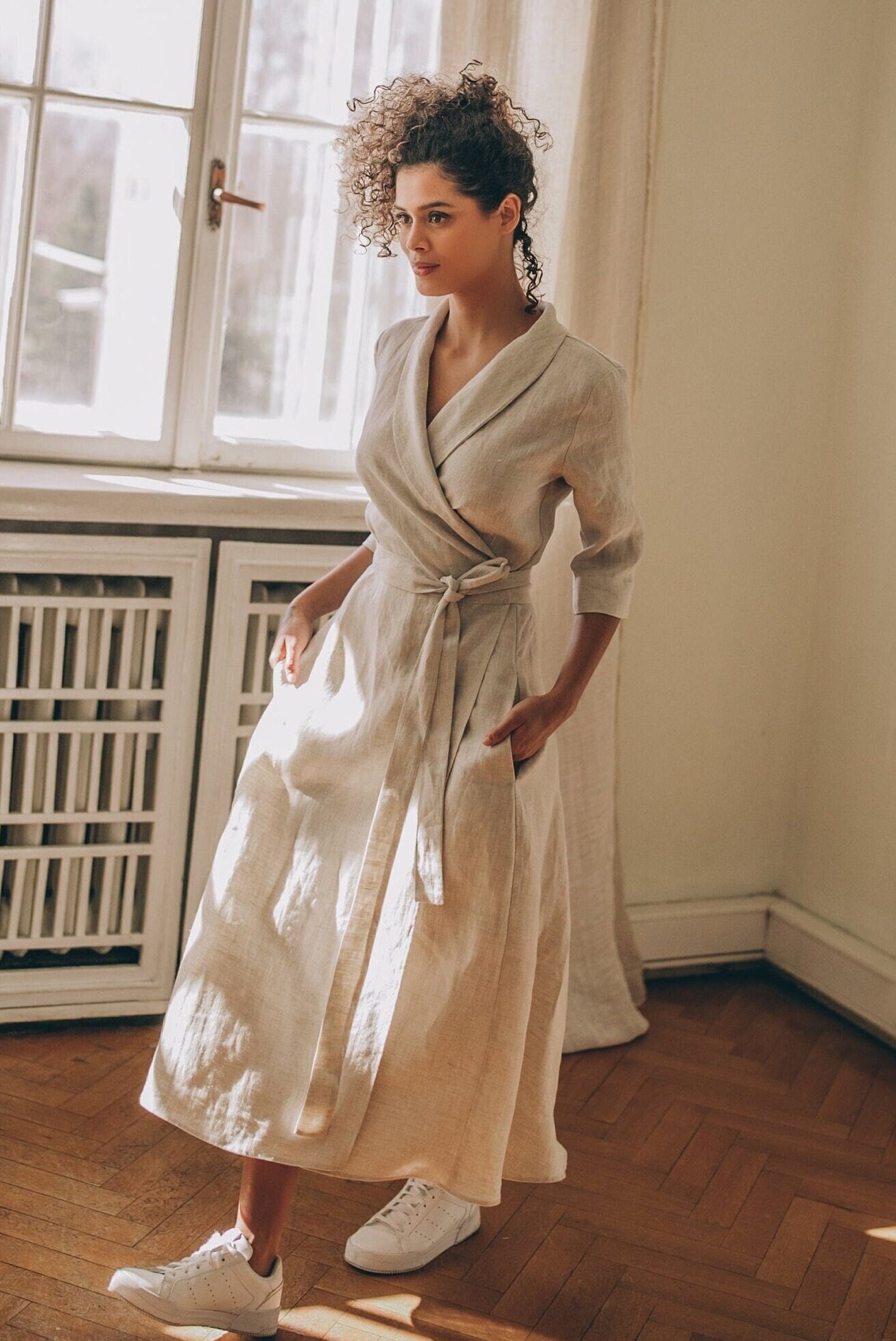 Experience timeless style with our linen wrap dress in midi length, designed to offer both elegance and everyday comfort. Made from high-quality linen, this dress features a flattering wrap design that allows for an adjustable fit. The sophisticated shawl collar adds a refined touch, while the practical side pockets make it as functional as it is stylish. The midi-length hem strikes the perfect balance between casual and chic, making it suitable for a variety of occasions.