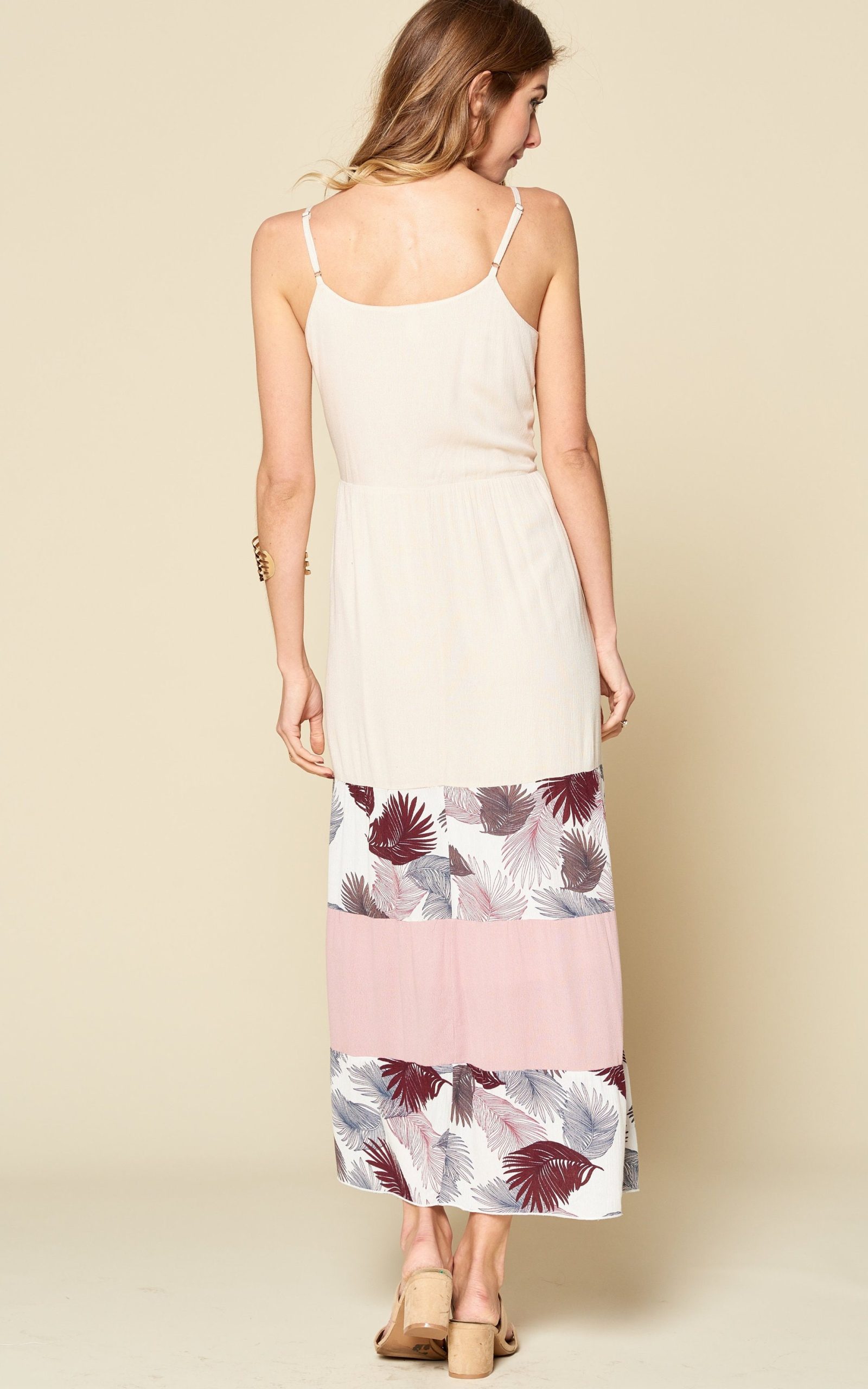 Vanilla-pink color blocked maxi dress featuring tropical print.