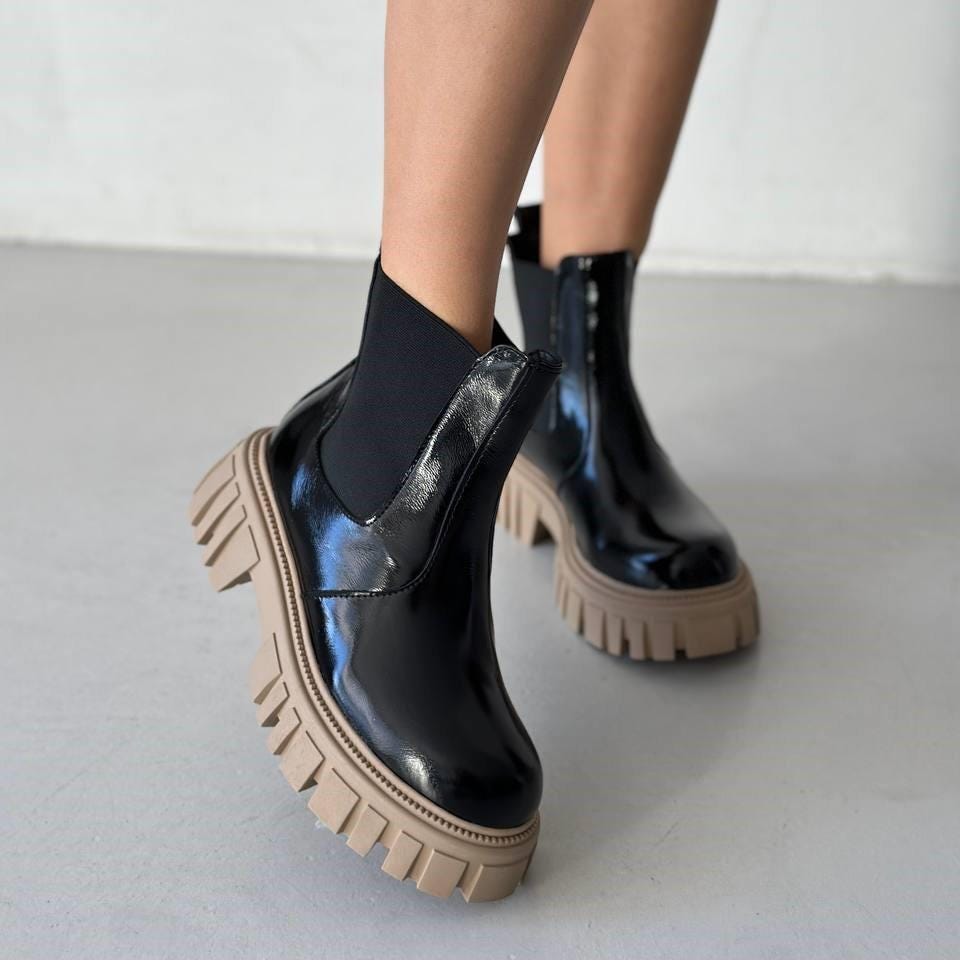 Step into the perfect blend of style and practicality with these black chelsea boots, designed to elevate your cold-weather wardrobe. Featuring a chunky platform and a lug sole, these womens boots offer both bold grunge appeal and reliable traction for winter days. Handcrafted in Ukraine from premium leather or patent naplak, they slip on easily while keeping your feet warm and comfortable.
